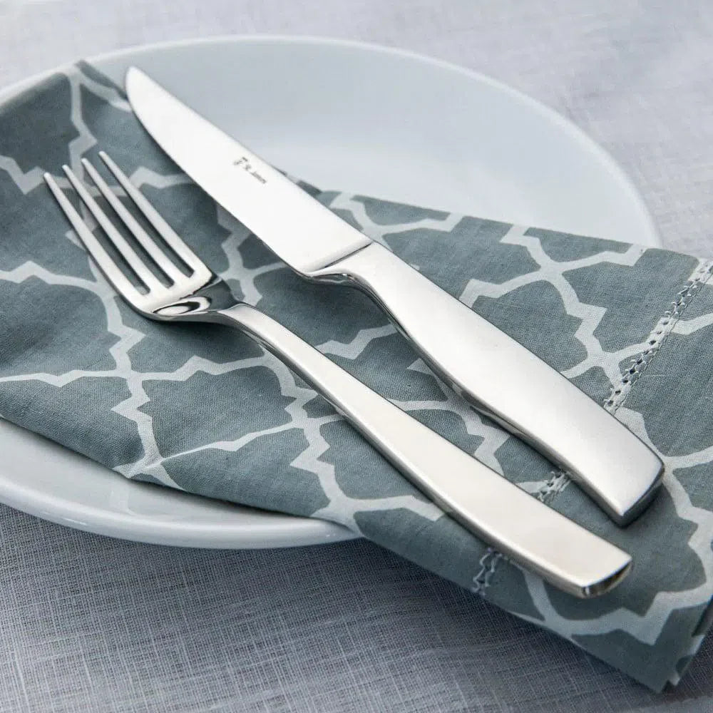 Produzido em aço inoxidável 18/10, com 4mm de espessura, as peças possuem design marcante e acabamento luxuoso, dando um toque a mais de classe e requinte à sua mesa. As facas possuem lâminas temperadas, que mantêm o corte por mais tempo e não causam riscos nas superfícies dos pratos, conservando-os.